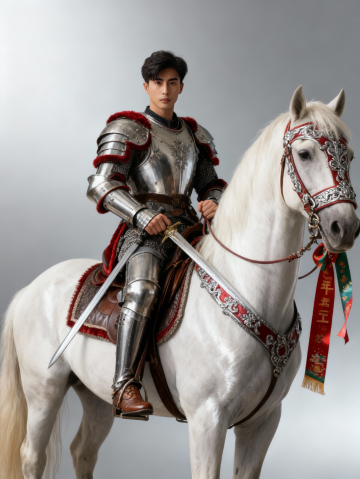 融合中式古典与欧洲宫廷艺术的3D重拟物风格,骑士身披鎏银铠甲,坐骑白骏马饰以红金华冠,尽显奢华优雅,春节元素点缀,传递节日喜庆。