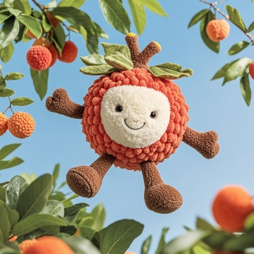 可爱拟人化的荔枝玩偶,采用面料风设计,卡通感十足,仿佛在树间跳跃。