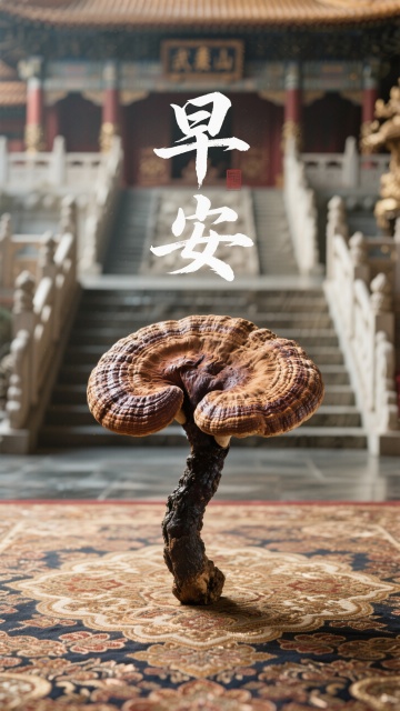 中式古典庙宇前,灵芝悬浮地毯之上,超现实国潮风,神圣感十足。