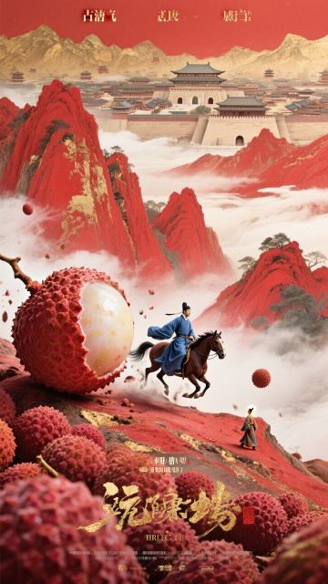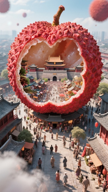 中式古典建筑与荔枝双重曝光,3D超现实主义风格,梦幻般融合传统与现代。画面由一个巨大的红色荔枝构成,果肉里面是一座繁华的古代长安城池。周边街道热闹景象。色彩保和明亮,肌理磨砂,高斯模糊,动态模糊。超高空俯视,超广角镜头。氛围大气而灵动,极具观赏性。