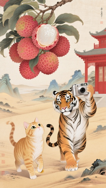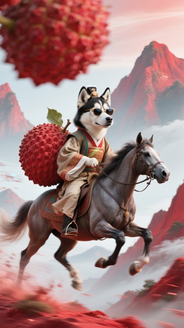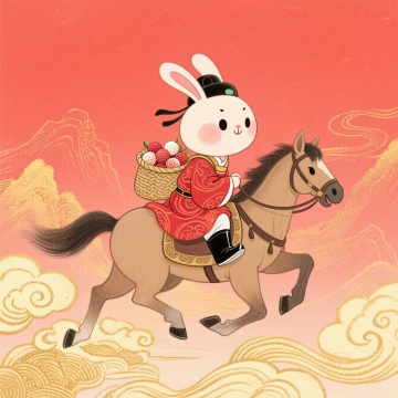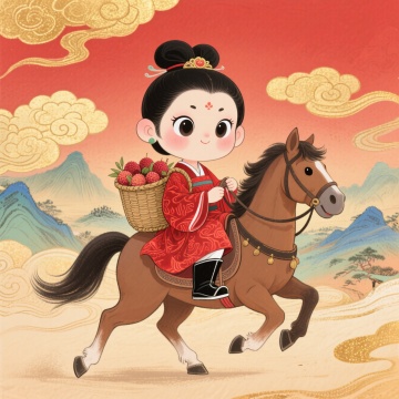 可爱卡通插画风,国潮元素融入,轻拟物手法表现,少女骑马携荔枝,节日氛围浓厚。