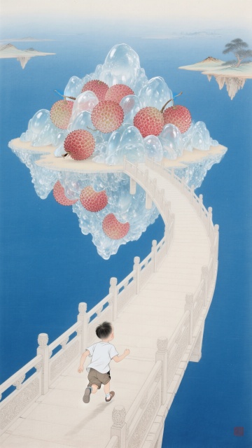 微缩艺术风,超现实主义玻璃碗中荔枝如海景般清新浪漫,趣味感十足。