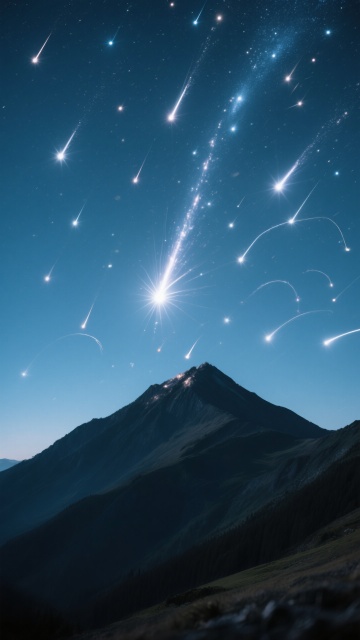 梦幻插画风,流星雨洒落山巅,虚拟现实中的浪漫唯美景致。