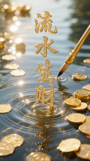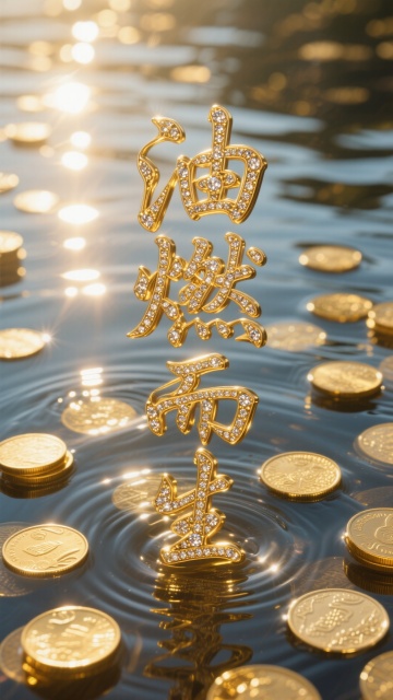主体为金子做的“油燃而生”,上面镶嵌珠宝,毛笔书法字体竖排版,背景:金币散落在清澈水中,暖阳光在硬币和水波纹上投射清晰高光与阴影,奢华金色调,硬币表面和水纹的精细纹理,散点构图带局部扎堆,浅景深模糊背景