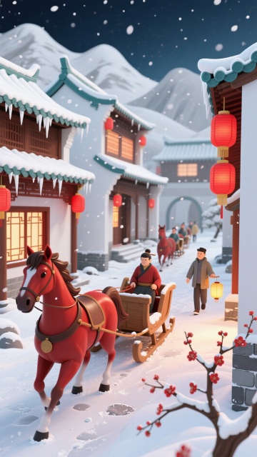 3D重拟物风呈现雪夜古巷,红马雪橇穿行于灯火通明的中式建筑间,国潮元素与喜庆灯笼交织,营造温馨故事感,传递浓郁年味。