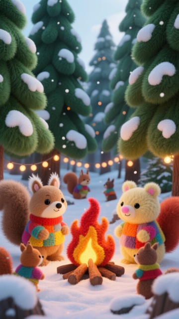 软3D风圣诞场景,拟人化毛绒动物环绕少女,毛发生长质感与面料细节营造梦幻温馨氛围,可爱趣味十足。