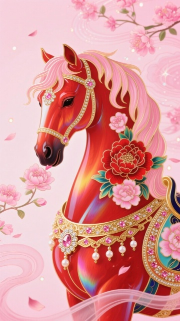 工笔白描四骏奔腾,水墨晕染粉红背景,唯美感与梦幻感交织,中式意境悠然,水彩风轻盈灵动。