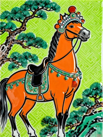 复古剪纸风马匹,融合民族纹样与皮影造型,卡通化设计,金牛帽点缀,喜庆春节氛围。