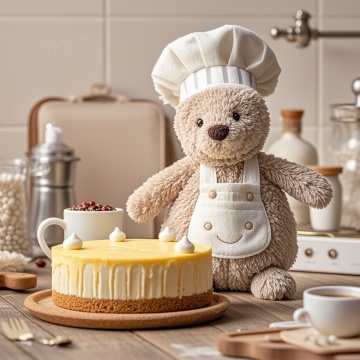 可爱卡通熊拟人化,身穿厨师服,陪伴美味蛋糕,温馨厨房氛围。