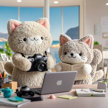 可爱猫咪拟人化,手持相机与书本,展现柔软卡通风,营造温馨办公氛围。