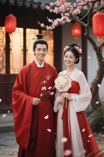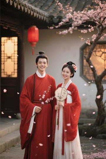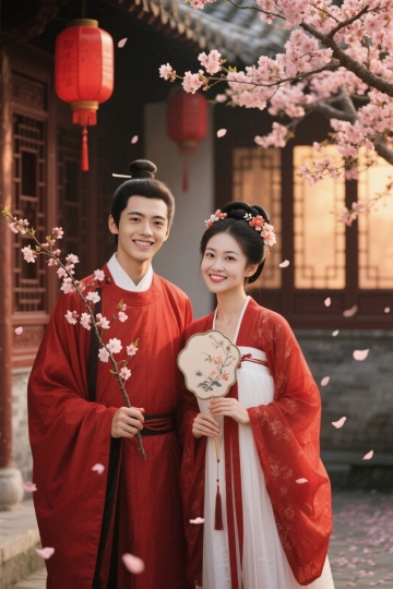 工笔风与刺绣风交融,红白汉服映衬樱花纷飞,中式庭院间红灯笼高挂,营造古典喜庆浪漫氛围,唯美主义演绎传统婚嫁之韵。