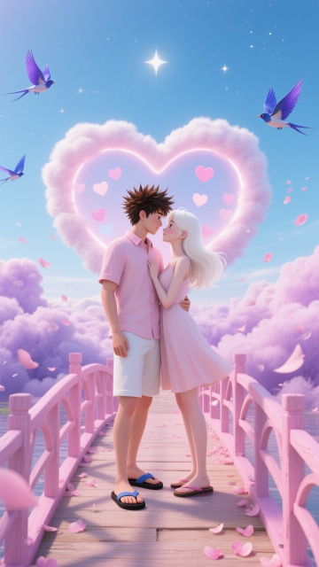 梦幻古典插画风,中式情侣拟人化,七夕节浪漫氛围。