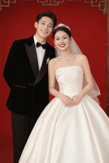中式红墙映衬,新人笑靥如花,喜庆浪漫,优雅国潮风。