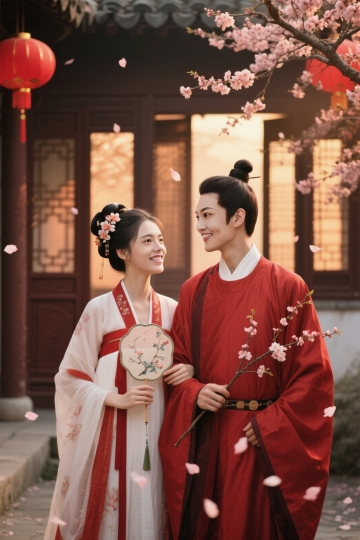 古风情侣写真,男子束发,身着红色古风长袍,女子梳发髻、插花朵,穿红白配色古风裙装。古代庭院背景,有传统门窗、黄昏暖光、红色灯笼、一棵桃花树。男生手拿桃花枝,女主手持精致团扇。飘落花瓣增添意境。两人面带微笑自然地看向镜头。