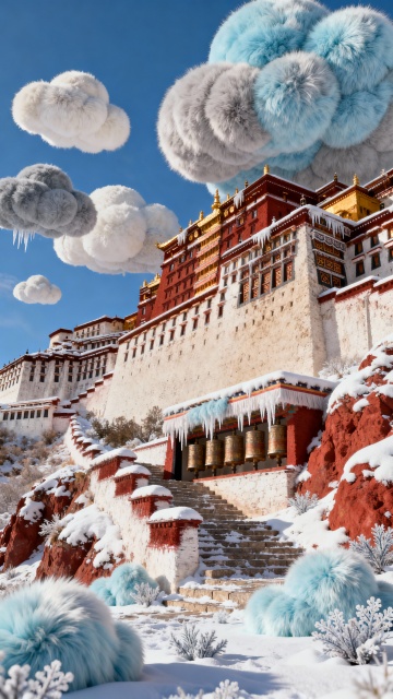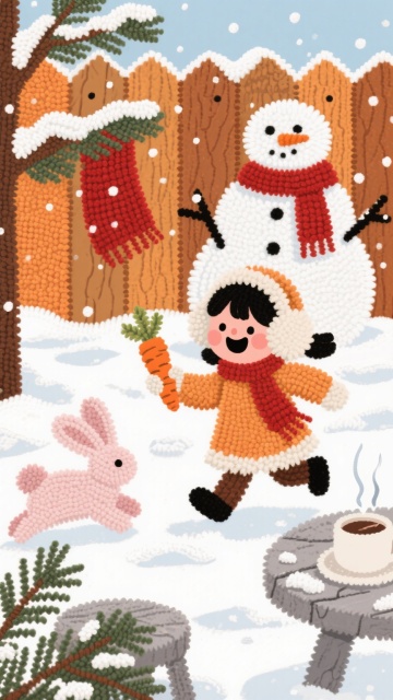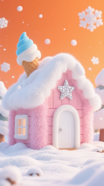梦幻雪景中,3D卡通风格的木箱上写着“Snow”,毛绒云朵飘浮,手套投递条纹信封,重拟物与毛发生长风交织,营造温馨趣味的冬日童话。