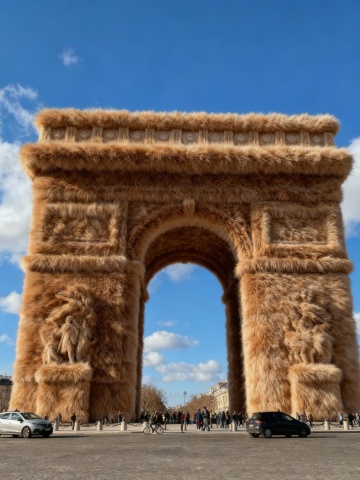毛发生长风包裹凯旋门,重拟物与超现实主义碰撞,实景感中透出趣味冲击,体积感十足的绒毛巨构颠覆经典。