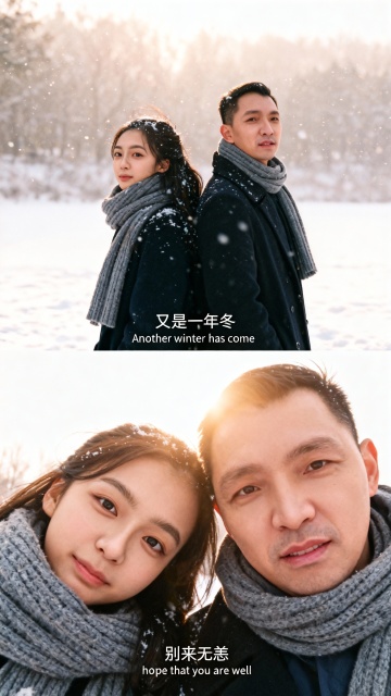 胶片风双色设计,实景雪景中光影柔和,人物背影与近景交织,营造温馨浪漫的冬日文艺感,传递别来无恙的深情问候。