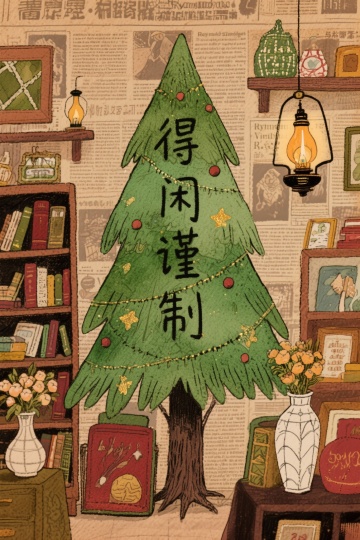 复古插画风圣诞树,融合国潮大字“得闲谨制”,拼贴报纸背景与书架陈设,暖灯点缀,营造文艺温馨的节日氛围。