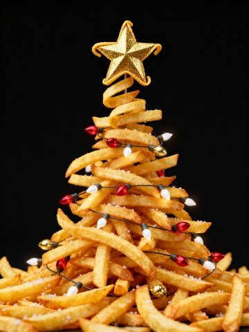 薯条堆叠成圣诞树,鎏金星顶点缀彩灯,微缩艺术风融合波普色彩,金属质感与重拟物设计交织,喜庆趣味感十足。