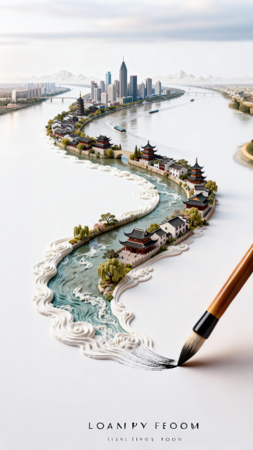 一支正在绘画的毛笔,笔尖在画面右下角,描摹出一条由右下到左上的细笔迹曲线,笔迹内部是微观的中国南京地标性景观,包含长江与秦淮河交汇处烟波浩渺的景象,新街口到夫子庙沿岸的明清古建筑与金陵现代建筑交汇,老门东的古色古香秦淮民居建筑点缀其间,整体呈现出立体浮雕效果,笔迹之外为纯净的白色留白,背景是纯白色,融合传统中国风与现代立体艺术,高细节,超写实,HDR效果