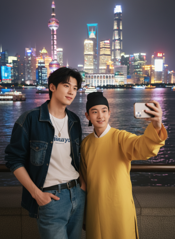 国潮风与都市夜景交融,传统服饰邂逅现代地标,红灯笼与霓虹光影交织,女孩和李白合影,实景感十足的喜庆氛围中透出浓厚的国庆节民族情愫。