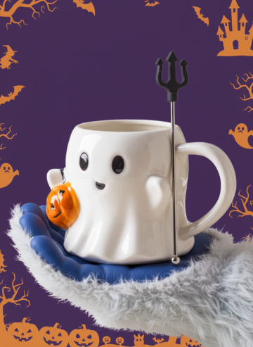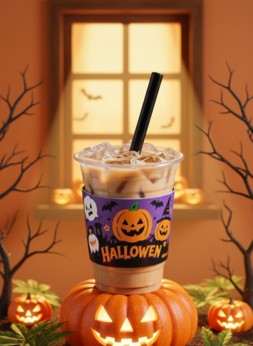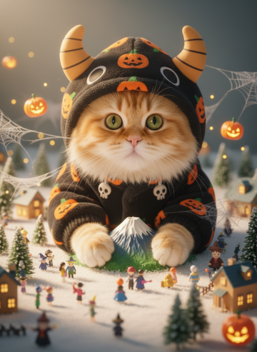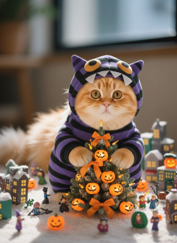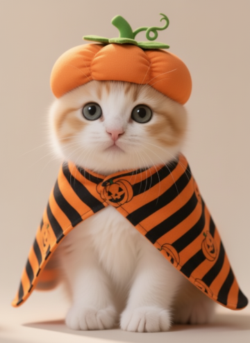 软3D风格萌猫,戴南瓜帽披条纹斗篷,可爱卡通感十足,梦幻温馨,万圣节主题设计。