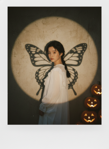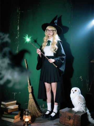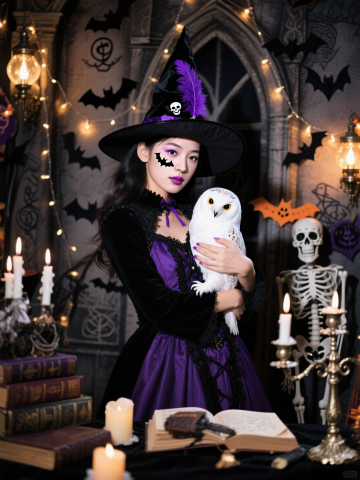 哥特风巫女怀抱白鸮,紫黑裙装与烛光交织,复古油画质感,神秘光影中尽显万圣节魔幻氛围。